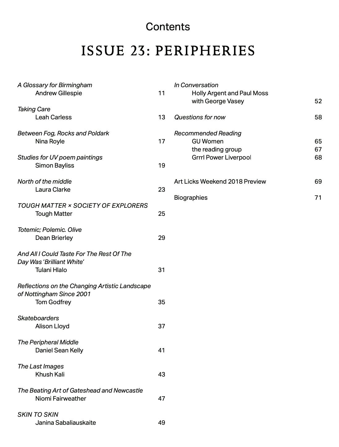 Issue 23 of Art Licks is co-edited by George Vasey and Holly Willats on the theme of peripheries. The issue was developed in response to discussions that emerged from the exhibition The Everyday Political at Southwark Park Galleries. The launch of the magazine coincided with the Art Licks Weekend 2018 programmed around the same topic.
