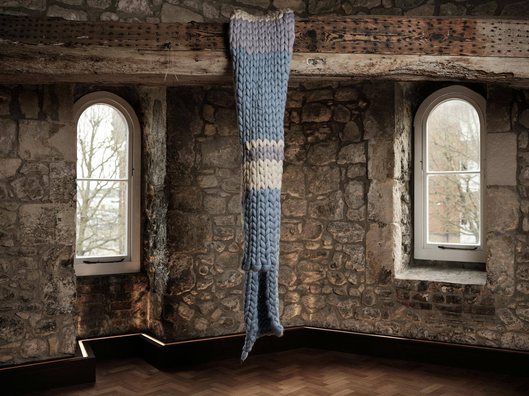 The installation is made with materials significant to the building’s layered histories including: wool which was pillaged from the King by invading French troops. Rope which was picked by the female prisoners to source oakum. The metal wire signifies the metal of the prisoner’s chains and the chains of a ship’s anchor that are fashioned into symbolic keyhole gun ports that connect the building to the sea. The predominate colour of the dyed wool is pastel blue and ivory which mimics the colour of sea foam lapping at the Southampton shoreline and the clouds above it, connecting the ocean and sky. The wool is embroidered with words such as ‘windrush, passage, living and crumbling’ taken from dialogue in Collecting God’s House Tower’s Stories film, eliding personal and collective memories.